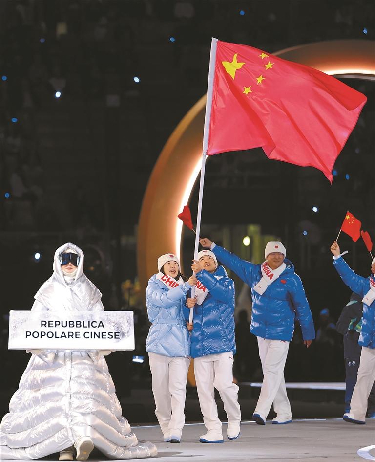 图①:2月6日,中国体育代表团旗手宁忠岩(左三)、张楚桐(左二)在开幕式上入场。