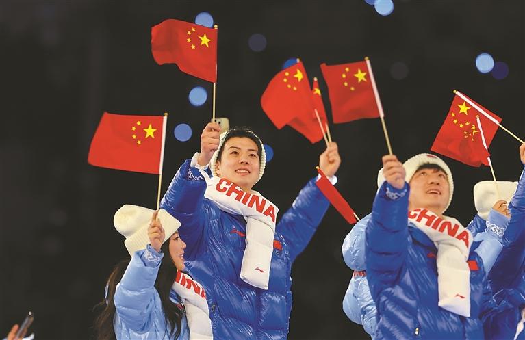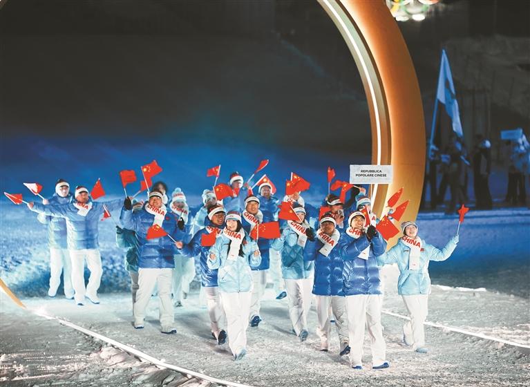 图②:2月6日,中国体育代表团在利维尼奥参加入场仪式。